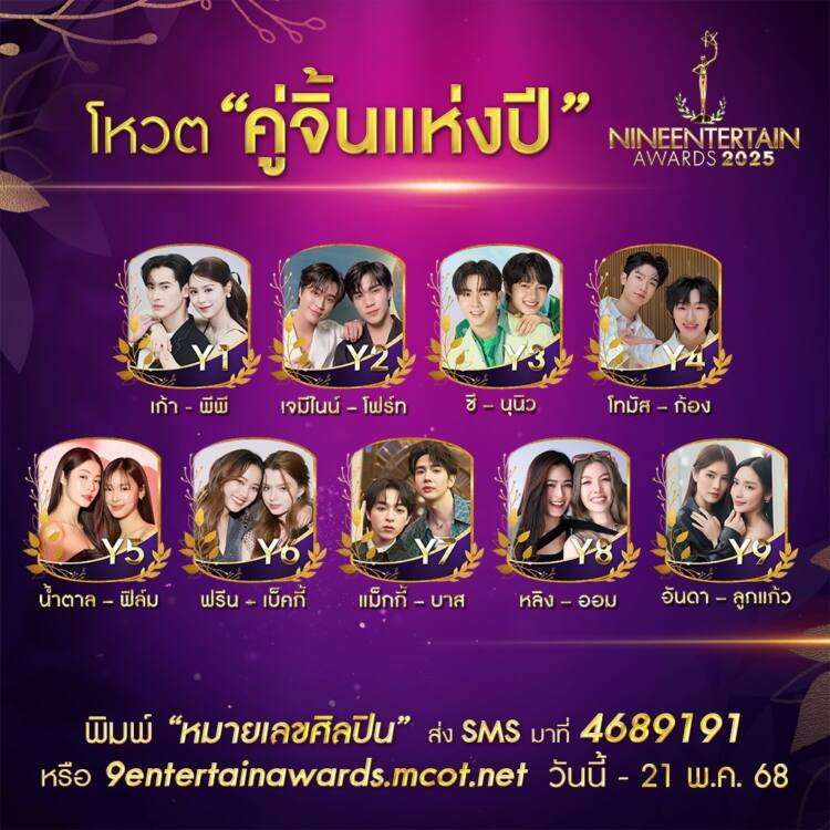 งานประกาศรางวัลหน้าม่านคุณภาพ หลังม่านคุณธรรม “ไนน์เอ็นเตอร์เทน อวอร์ด 2025” ที่ทาง อสมท จัดขึ้นทุกปี เพื่อเป็นกำลังใจ แรงใจ ให้กับนักแสดง ศิลปินในวงการบันเทิงหลากหลายสาขา และหนึ่งในสาขาที่คนทั้งประเทศสามารถร่วมโหวตได้ นั่นก็คือรางวัล “คู่จิ้นแห่งปี” ซึ่งตอนนี้เราได้ 9 ผู้ผ่านเข้ารอบ มีทั้งนักแสดงและศิลปินโดยมีการเรียงตามลำดับตามชื่อเล่น