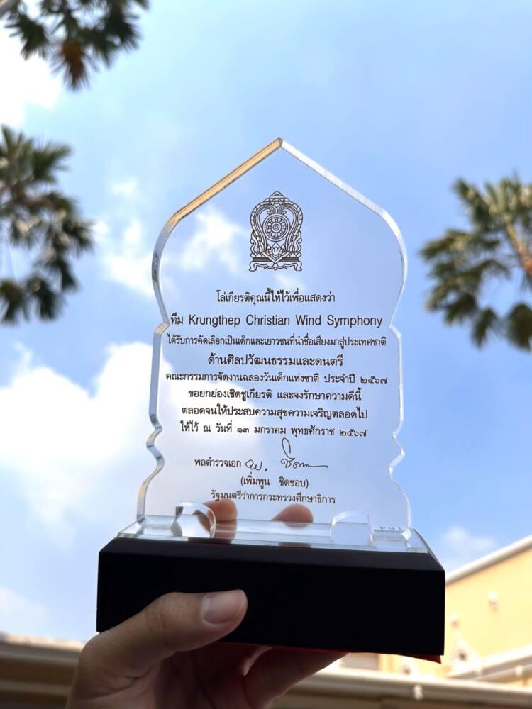 วงดุริยางค์โรงเรียนกรุงเทพคริสเตียนวิทยาลัยได้ผ่านการพิจารณาคัดเลือกเด็กและเยาวชนดีเด่นและนำชื่อเสียงมาสู่ประเทศชาติ ประจำปี 2567 เพื่อเข้าเยี่ยมคารวะนายกรัฐมนตรี เนื่องในงานฉลองวันเด็กแห่งชาติ ประจำปี 2567 เมื่อวันที่ 10 มกราคม 2567 โดยการรับราวัลในครั้งนี้พิจารณาการคัดเลือกจากผลงานของวงดุริยางค์โรงเรียนกรุงเทพคริสเตียนวิทยาลัยที่ได้รับรางวัล GOLD DISTINCTION เหรียญทองเกียรติยศ WINNER IN MIDDLE CLASS ชนะเลิศการประกวดในระดับนานาชาติในงานเทศกาลดนตรี The 24th International Festival of Wind Orchestras Prague เมื่อวันที่ 24 มิถุนยน 2566 ณ โรงแรม Olsanka Congress Hall กรุงปราก สาธารณรัฐเช็ก และรางวัล GOLD DISTINCTION เหรียญทองเกียรติยศ รองชนะเลิศอันดับ 1 ในการประกวดวงดุริยางค์นั่งบรรเลงระดับนานาชาติรายการ Rasteder International Music Festival 2023 (European Open Championship) เมื่อวันที่ 2 ก.ค. 2566 ณ เมืองอาร์สทีเดอร์ (Rastede) ประเทศเยอรมนี