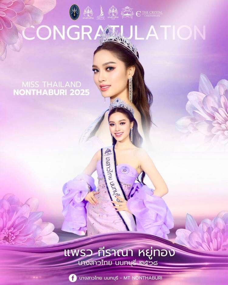 โดยในปีนี้ ได้เฟ้นหาสาวงาม ตัวแทนจังหวัด สู่เวทีนางสาวไทย 2568 และ ขอแสดงความยินดี “น้องแพรว นางสาว กีราณา หยู่ทอง” ดีกรี นิสิตจากจุฬาลงกรณ์มหาวิทยาลัย อักษรศาสตร์ ภาคอินเตอร์ ปีที่ 2 คว้ามงกุฎนางสาวไทยนนทบุรี ๒๕๖๘ ไปครองได้สำเร็จ และ ยังพ่วงตำแหน่ง รางวัลขวัญใจเมืองนนทบุรี