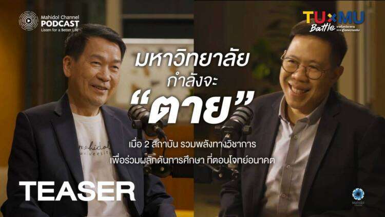 เพื่อสื่อสารแนวคิดนี้ให้เข้าถึงสาธารณชนอย่างสร้างสรรค์ ทั้งสองมหาวิทยาลัยยังได้ร่วมกันเปิดตัวรายการพอดแคสต์ “TU x MU Battle: จากโลกวิชาการสู่โลกความจริง” รายการพูดคุยรูปแบบ Casual Talk Show ที่เปิดพื้นที่ให้ผู้บริหารและนักวิชาการจากทั้งสองสถาบัน ได้แลกเปลี่ยนมุมมองในประเด็นร่วมสมัยอย่างตรงไปตรงมา Kick-off ตอนแรกในหัวข้อ “มหาวิทยาลัยยังจำเป็นอยู่ไหม? ในโลกยุคนี้” ได้นำเสนอวิสัยทัศน์จากสองอธิการบดี โดยชี้ว่า การศึกษาไม่ควรถูกจำกัดไว้ในกรอบวิชาอีกต่อไป แต่ต้องเน้นการเรียนรู้แบบบูรณาการ สร้างทักษะที่แท้จริง และส่งเสริมศักยภาพในการปรับตัวของผู้เรียนให้ทันโลกที่เปลี่ยนแปลง ตลอดซีรีส์ ยังมีประเด็นชวนคิดอีกมากมาย อาทิ Home Unsweeted Home หมอ กฎหมาย คนไข้: เรื่องจริงจากห้องตรวจ ที่จะสะท้อนมุมมองสังคมศาสตร์ นิติศาสตร์ และแพทยศาสตร์ อย่างถึงแก่น เจาะลึกประเด็นที่ยากจะมีเวทีไหนกล้าคุย ติดตามรายการได้ทาง Mahidol Channel: https://channel.mahidol.ac.th | YouTube: https://www.youtube.com/mahidolchannel