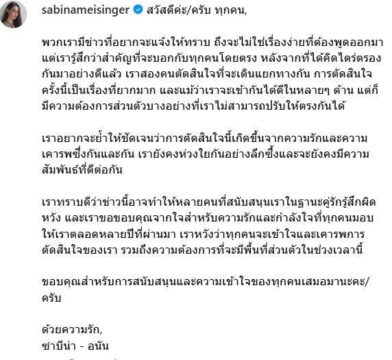 เราทราบดีว่าข่าวนี้อาจทำให้หลายคนที่สนับสนุนเราในฐานะคู่รักรู้สึกผิดหวัง และเราขอขอบคุณจากใจสำหรับความรักและกำลังใจที่ทุกคนมอบให้เราตลอดหลายปีที่ผ่านมา เราหวังว่าทุกคนจะเข้าใจและเคารพการตัดสินใจของเรา รวมถึงความต้องการที่จะมีพื้นที่ส่วนตัวในช่วงเวลานี้
