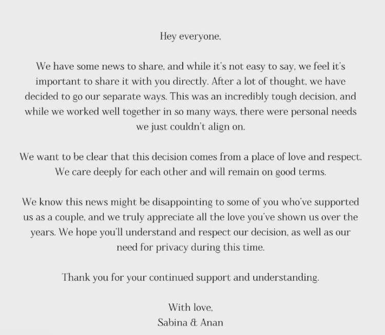 “สวัสดีค่ะ/ครับ ทุกคน, พวกเรามีข่าวที่อยากจะแจ้งให้ทราบ ถึงจะไม่ใช่เรื่องง่ายที่ต้องพูดออกมา แต่เรารู้สึกว่าสำคัญที่จะบอกกับทุกคนโดยตรง หลังจากที่ได้คิดไตร่ตรองกันมาอย่างดีแล้ว เราสองคนตัดสินใจที่จะเดินแยกทางกัน การตัดสินใจครั้งนี้เป็นเรื่องที่ยากมาก และแม้ว่าเราจะเข้ากันได้ดีในหลายๆ ด้าน แต่ก็มีความต้องการส่วนตัวบางอย่างที่เราไม่สามารถปรับให้ตรงกันได้