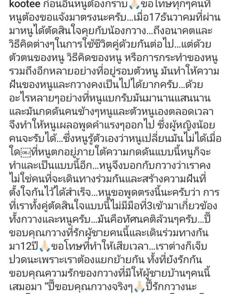 ปี๊ขอบคุณกวางที่รักผู้ชายคนนี้และเดินร่วมทางกันมา 12 ปี🙏🏻ขอโทษที่ทำให้เสียเวลา…เราต่างก็เจ็บปวดนะ เพราะเราต้องแยกย้ายกัน ทั้งที่ยังรักกัน ขอบคุณความรักของกวางที่มีให้ผู้ชายบ้านๆ คนนี้เสมอมา “ปี๊ขอบคุณกวางจริงๆ🙏🏻ปี๊รักกวางนะ❤️”โกเคยบอกกับหนูว่าทะเลาะกันอย่าโพสลงโซเชียล หนูต้องกราบขอโทษ🙏🏻โกด้วยครับ ครั้งนี้มันไม่ได้เป็นการทะเลาะกันเลยครับ😔…