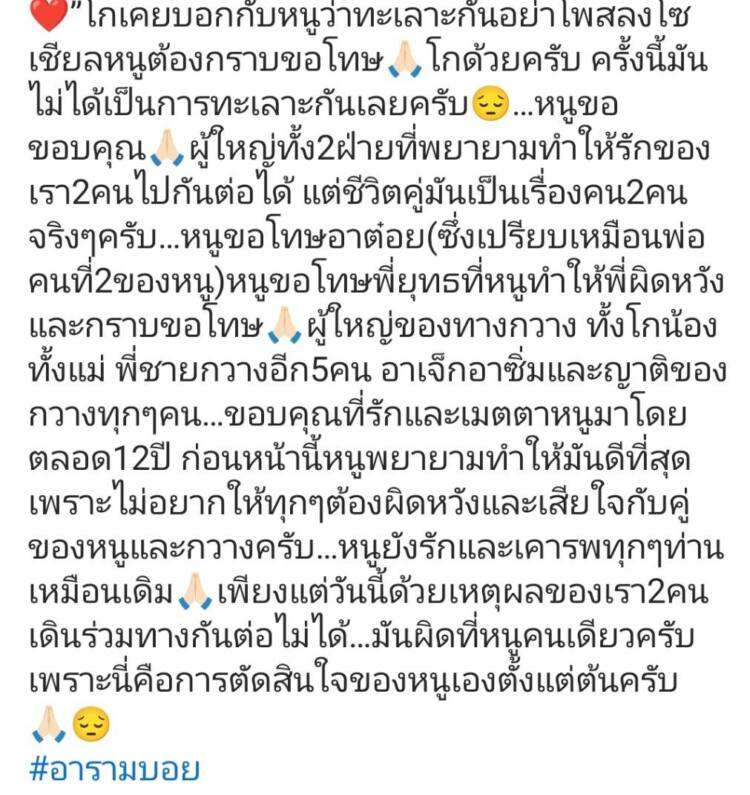 หนูขอขอบคุณ🙏🏻ผู้ใหญ่ทั้ง 2 ฝ่ายที่พยายามทำให้รักของเรา 2 คนไปกันต่อได้ แต่ชีวิตคู่มันเป็นเรื่องคน 2 คนจริงๆ ครับ…หนูขอโทษอาต๋อย(ซึ่งเปรียบเหมือนพ่อคนที่2ของหนู) หนูขอโทษพี่ยุทธที่หนูทำให้พี่ผิดหวังและกราบขอโทษ🙏🏻ผู้ใหญ่ของทางกวาง ทั้งโกน้อง ทั้งแม่ พี่ชายกวางอีก 5 คน อาเจ็กอาซิ่มและญาติของกวางทุกๆ คน…ขอบคุณที่รักและเมตตาหนูมาโดยตลอด12ปี ก่อนหน้านี้หนูพยายามทำให้มันดีที่สุดเพราะไม่อยากให้ทุกๆ ต้องผิดหวังและเสียใจกับคู่ของหนูและกวางครับ…หนูยังรักและเคารพทุกๆท่านเหมือนเดิม🙏🏻เพียงแต่วันนี้ด้วยเหตุผลของเรา 2 คนเดินร่วมทางกันต่อไม่ได้…มันผิดที่หนูคนเดียวครับ เพราะนี่คือการตัดสินใจของหนูเองตั้งแต่ต้นครับ 🙏🏻😔 #อารามบอย”