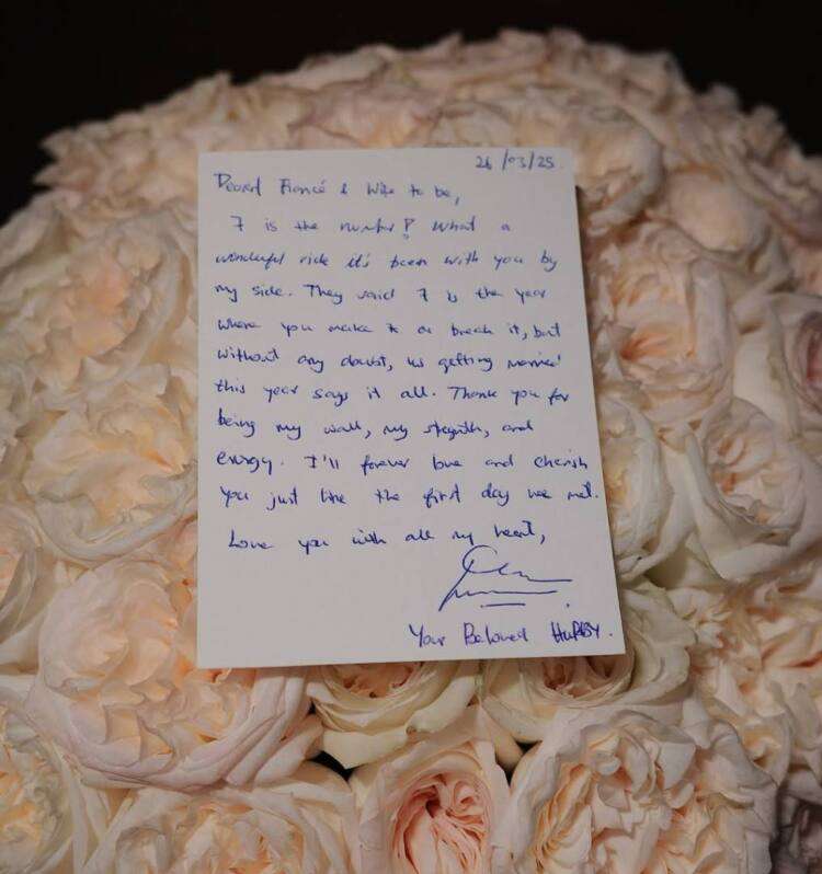 ซึ่งแปลได้ว่า “ดอกไวท์โอฮาร่า 70 ดอก สำหรับ 7 ปีมหัศจรรย์ที่เราอยู่ด้วยกัน