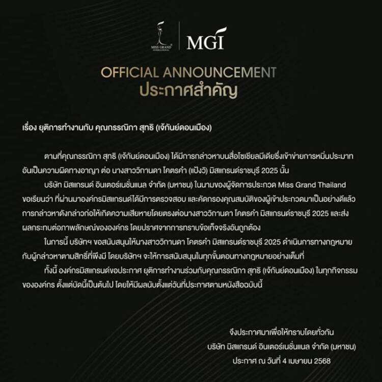 ขณะที่เฟซบุ๊ก มิสแกรนด์ ไทยแลนด์ ออกประกาศ เจ๊กัน ดอนเมือง ได้กล่าวหาแป้งวิบนโซเชียลมีเดีย เข้าข่ายหมิ่นประมาท อันเป็นความผิดทางอาญา กระทบภาพลักษณ์องค์กร บริษัทมิสแกรนด์ อินเตอร์ฯ สนับสนุนให้แป้งวิ ดำเนินการตามกฎหมาย บริษัทพร้อมสนับสนุนเต็มที่ และขอประกาศยุติการทำงานกับเจ๊กัน ดอนเมือง ทุกกิจกรรมขององค์กร ตั้งแต่บัดนี้เป็นต้นไป ให้มีผลนับตั้งแต่วันประกาศ