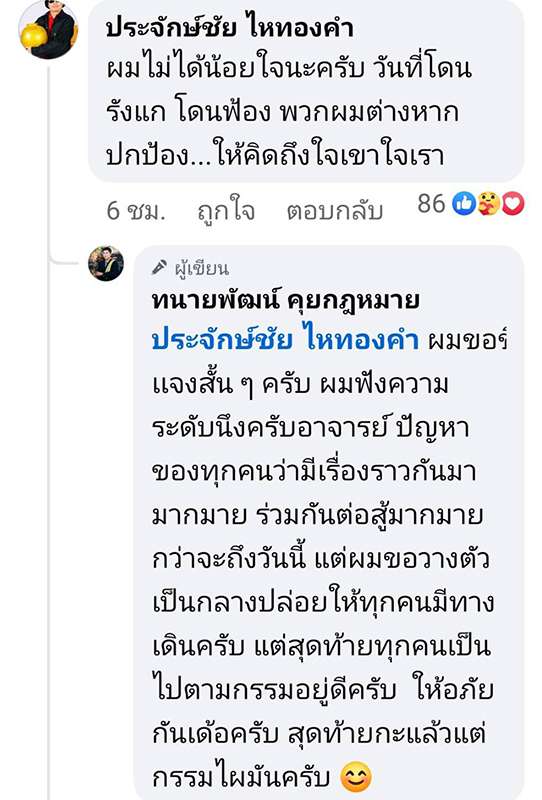 ทนายพัฒน์ จึงแท็กประจักษ์ชัย ชี้แจงว่า “ผมขอชี้เเจงสั้น ๆ ครับ ผมฟังความระดับนึงครับอาจารย์ ปัญหาของทุกคนว่ามีเรื่องราวกันมามากมาย ร่วมกันต่อสู้มากมายกว่าจะถึงวันนี้ แต่ผมขอวางตัวเป็นกลางปล่อยให้ทุกคนมีทางเดินครับ แต่สุดท้ายทุกคนเป็นไปตามกรรมอยู่ดีครับ ให้อภัยกันเด้อครับ สุดท้ายกะแล้วแต่กรรมไผมันครับ ^_^”