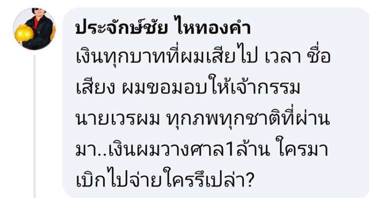 ซึ่ง “ประจักษ์ชัย” ก็ได้เข้ามาเมนต์ว่า “เงินทุกบาทที่ผมเสียไป เวลา ชื่อเสียง ผมขอมอบให้เจ้ากรรมนายเวรผม ทุกภพทุกชาติที่ผ่านมา..เงินผมวางศาล 1 ล้าน ใครมาเบิกไปจ่ายใครรึเปล่า?”