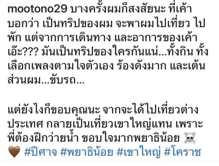 อย่างไรก็ตาม โตโน่เรียก “ณิชา” หวานใจว่า “พยาธิน้อย” ซึ่งที่มาที่ไปเจ้าตัวเผยว่าเคยอ่านในหนังสือเรื่อง เซียวฮื่อยี้ คือเวลาพระเอกมันรู้สึกอะไรหรือว่าทำอะไร นางเอกมันจะชอบรู้ทัน มันก็เลยเปรียบเทียบนางเอกเป็นพยาธิในตัวมันหรือไง รู้ทันไปหมด หรือว่าเข้าใจความรู้สึกของมัน เวลาตอนที่เจอณิชา ก็เลยนึกถึงประโยคนั้นของเซียวฮื่อยี้ ที่เปรียบเทียบคนที่เขารัก
