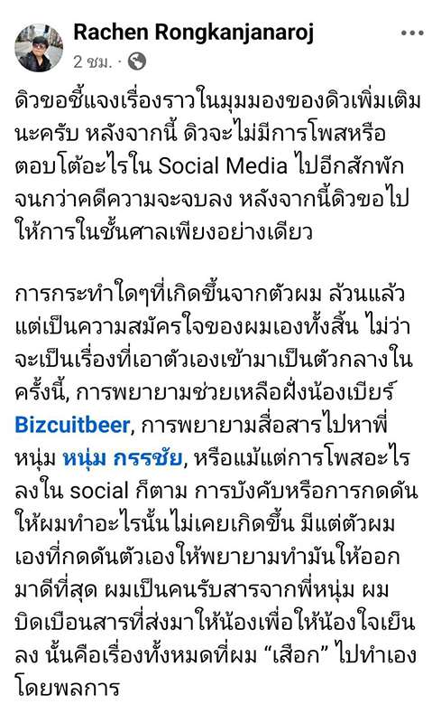 การกระทำใดๆ ที่เกิดขึ้นจากตัวผม ล้วนแล้วแต่เป็นความสมัครใจของผมเองทั้งสิ้น ไม่ว่าจะเป็นเรื่องที่เอาตัวเองเข้ามาเป็นตัวกลางในครั้งนี้, การพยายามช่วยเหลือฝั่งน้องเบียร์ Bizcuitbeer, การพยายามสื่อสารไปหาพี่หนุ่ม หนุ่ม กรรชัย, หรือแม้แต่การโพสต์อะไรลงใน social ก็ตาม การบังคับหรือการกดดันให้ผมทำอะไรนั้นไม่เคยเกิดขึ้น มีแต่ตัวผมเองที่กดดันตัวเองให้พยายามทำมันให้ออกมาดีที่สุด ผมเป็นคนรับสารจากพี่หนุ่ม ผมบิดเบือนสารที่ส่งมาให้น้องเพื่อให้น้องใจเย็นลง นั้นคือเรื่องทั้งหมดที่ผม “เสือก” ไปทำเองโดยพลการ