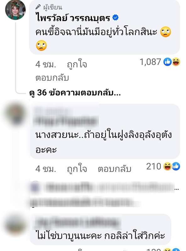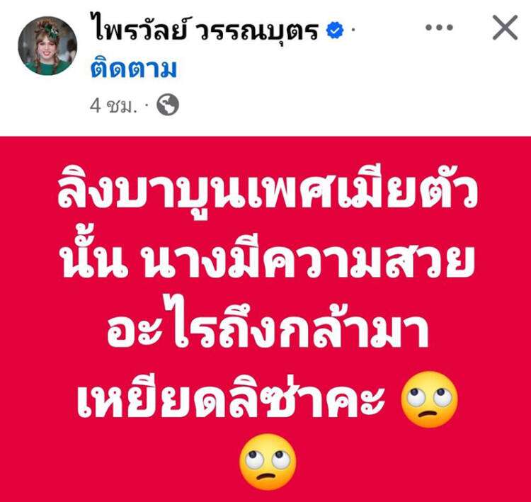 แม้แต่ “แพรรี่ ไพรวัลย์” อดีตพระนักเทศน์ชื่อดัง ก็ทนไม่ไหวเหมือนกัน โพสต์ฟาดว่า “ลิงบาบูนเพศเมียตัวนั้น นางมีความสวยอะไรถึงกล้ามาเหยียดลิซ่าคะ (อีโมจิมองบน)” พร้อมเมนต์ใต้โพสต์ว่า “คนขี้อิจฉานี่มันมีอยู่ทั่วโลกสินะ (อีโมจิมองบน)”