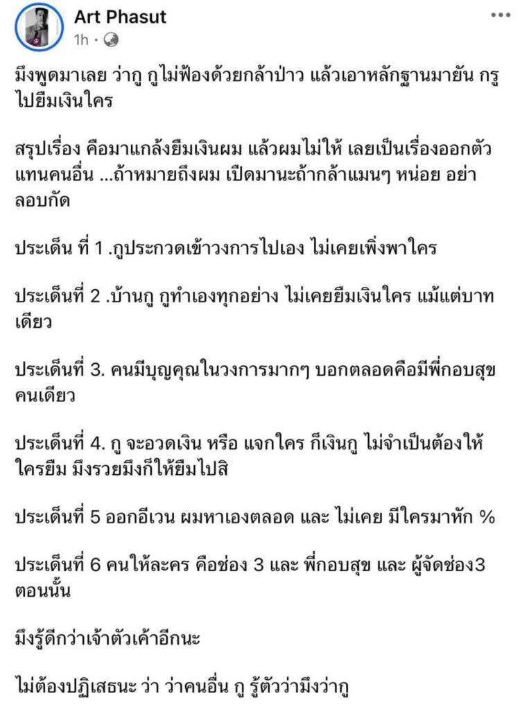 งานนี้ ทำ “อาร์ต พศุตม์” ถึงกับเดือด นำโพสต์ดังกล่าวมาแชร์ พร้อมฟาดว่า “มึงพูดมาเลย ว่ากู กูไม่ฟ้องด้วยกล้าเปล่า แล้วเอาหลักฐานมายัน กรูไปยืมเงินใคร สรุปเรื่อง คือมาแกล้งยืมเงินผม แล้วผมไม่ให้ เลยเป็นเรื่องออกตัวแทนคนอื่น …ถ้าหมายถึงผม เปิดมานะถ้ากล้าแมนๆ หน่อย อย่าลอบกัด”