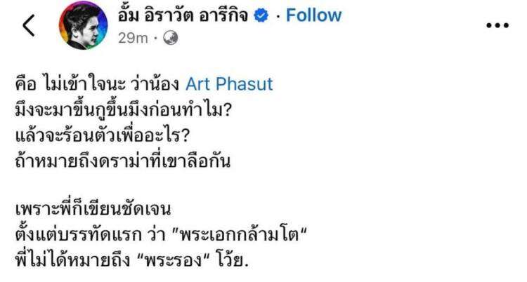 ต่อมา “อั้ม” โพสต์สวนกลับไปว่า… “คือ ไม่เข้าใจนะ ว่าน้อง Art Phasut มึงจะมาขึ้นกูขึ้นมึงก่อนทำไม? แล้วจะร้อนตัวเพื่ออะไร? ถ้าหมายถึงดราม่าที่เขาลือกัน เพราะพี่ก็เขียนชัดเจน ตั้งแต่บรรทัดแรก ว่า “พระเอกกล้ามโต” พี่ไม่ได้หมายถึง “พระรอง” โว้ย”