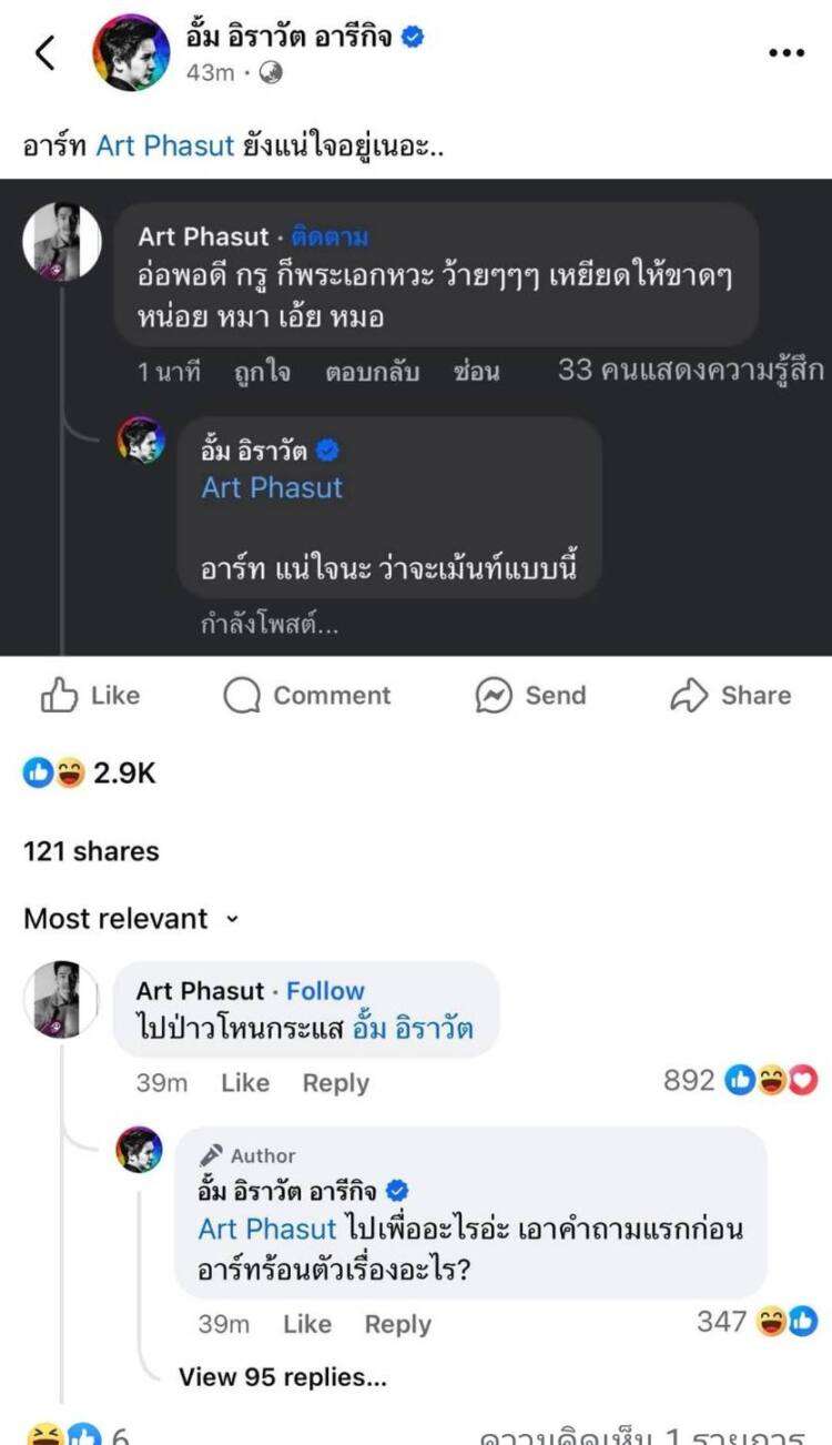งานนี้ อาร์ตถึงกับเดือด โพสต์สวนจุกๆ “พร้อมเสมอนะ อั้ม อิราวัต ถ้าแน่ก็มาโหนกระแสสักรอบมะ ได้ข่าวนักร้องเก่าหรอ ..ดังเพลงอะไรอะไม่เคยได้ยิน, ที่เพลงไม่ดังเพราะคนดูข้างหลังไม่เห็นหรือเปล่า กินนมเยอะนะนะ, เอารูป พระเอกละครมากระแทกหน้ามันหน่อยทุกคน ใครน้องมึง กรูมีพี่คนเดียว จะเรียก กู ไอ้สัตว์ ก็ได้นะ แล้วเค้าหาว่าผมไม่ใช่พระเอกว่ะ อ่อนฉิบหาย ชอบโหน อ่ะโหนกระแสสักรอบไหม”