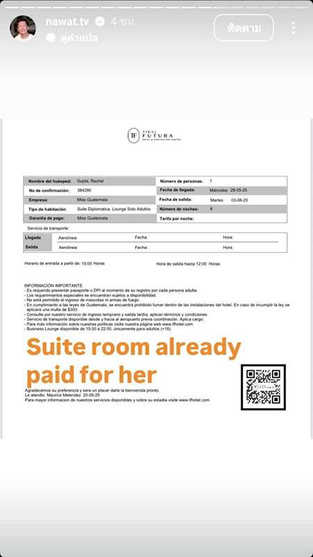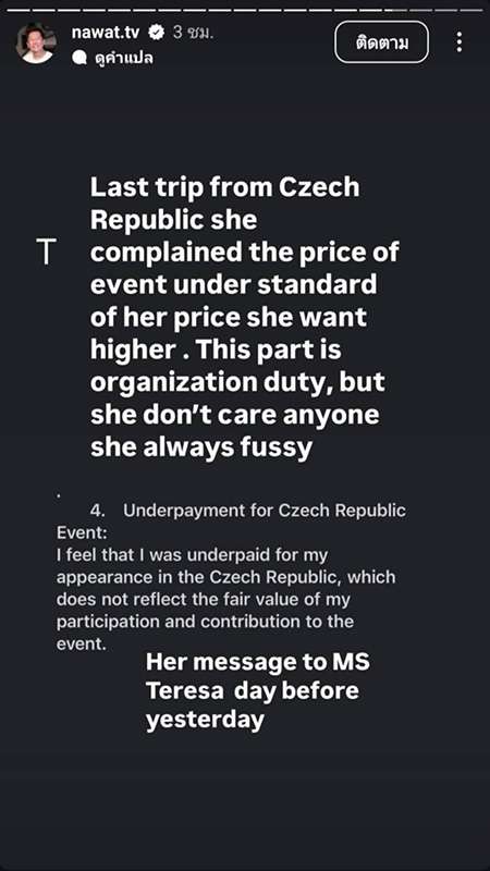 “เดี๋ยวจะสรุปแล้วโพสต์ให้ ในมิสแกรนด์อินเตอร์ฯ ให้ดูกันทั่วโลก ว่าสำนวนที่มันส่งมา มันดูถูกขนาดไหน ผิดคนแล้ว มันบอกว่าถ้าผมโวยวาย ออกโซเชียลไปว่ามัน มันจะเอาให้ผมไม่เหลือ เออ กูรออยู่ อีโรตี อีโรตีเน่า”