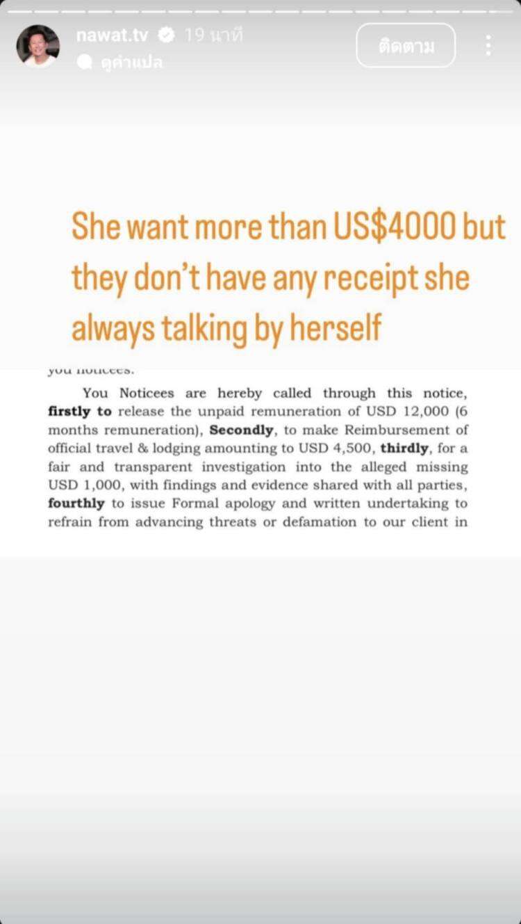 “เรื่องจ่ายเงิน เรายังไม่ได้จ่ายเงินเขาตั้งแต่พ.ย. 67 ถึงตอนนี้ เรามีในสัญญาชัดเจน หากเธอไม่อยู่ประเทศไทย ก็รวมเงินไว้ก่อน แล้วถึงให้เงินเธอทีเดียว บริษัทเราไม่ได้มีปัญหาการเงิน เงินแค่นี้กระจอกจะตายห่- โคตรกระจอก เงินไม่ได้เยอะ บริษัทเรามีเงินมากมาย เงินไม่กี่พันเหรียญเอง กระจอกมาก กระจ๊อกกระจอก เขาอยากได้เงิน ก็กลับมา เราก็ให้ ไม่มีปัญหา”