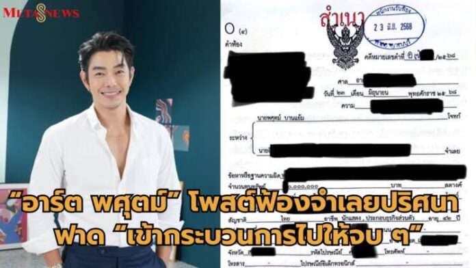 เดินหน้าฟาดไม่กลัวคำขู่ใดๆ สำหรับนักแสดงหนุ่ม “อาร์ต พศุตม์” ทำชาวเน็ตพากันใส่ใจ หลังโพสต์คำฟ้องจำเลยท่านหนึ่ง เว้นให้เห็นตัวหน้าว่า “อิ” คนติดตามเห็นก็คงรู้ว่าหมายถึงใคร โดยมูลค่าฟ้องสูงถึง 8 หลัก พร้อมแคปชั่น