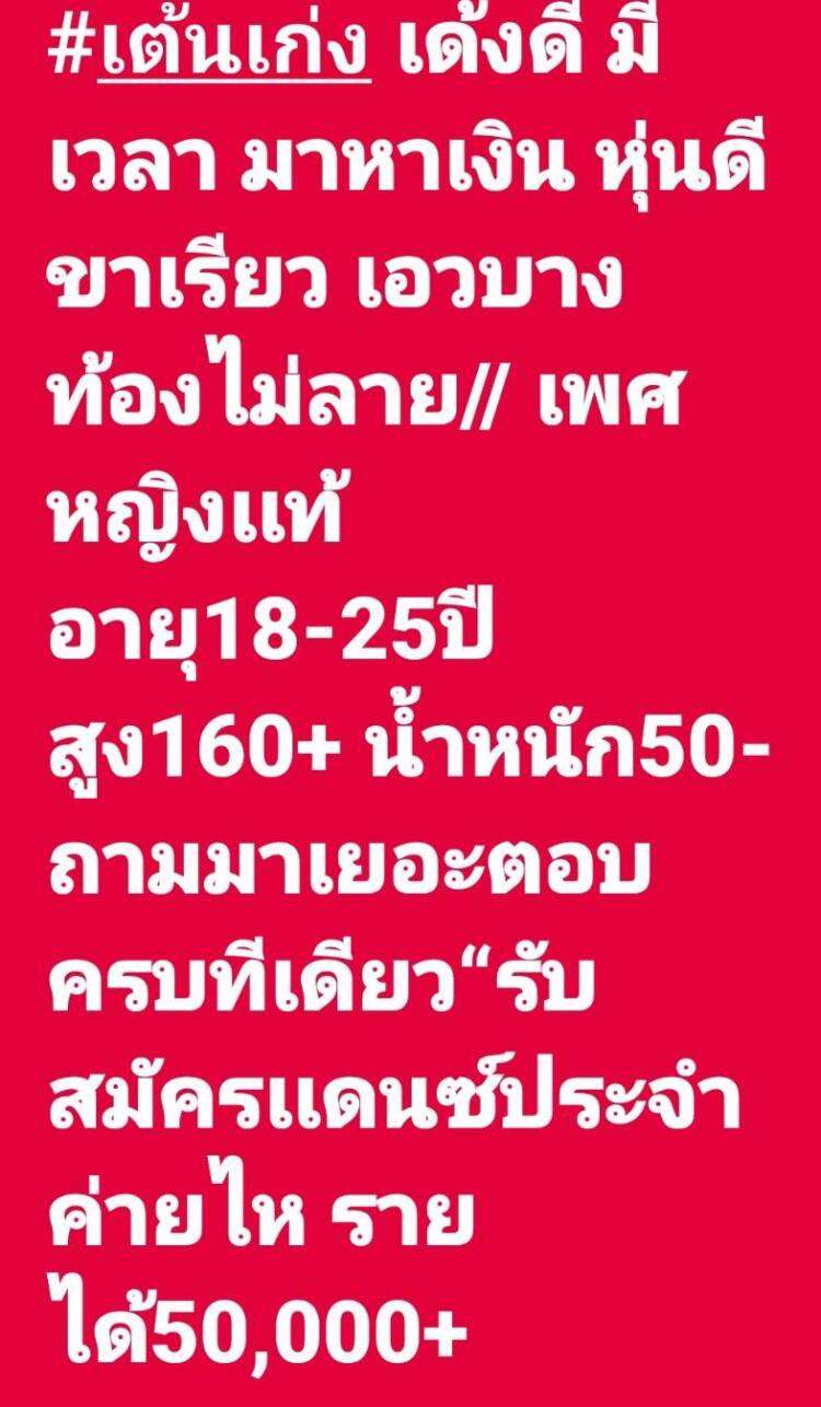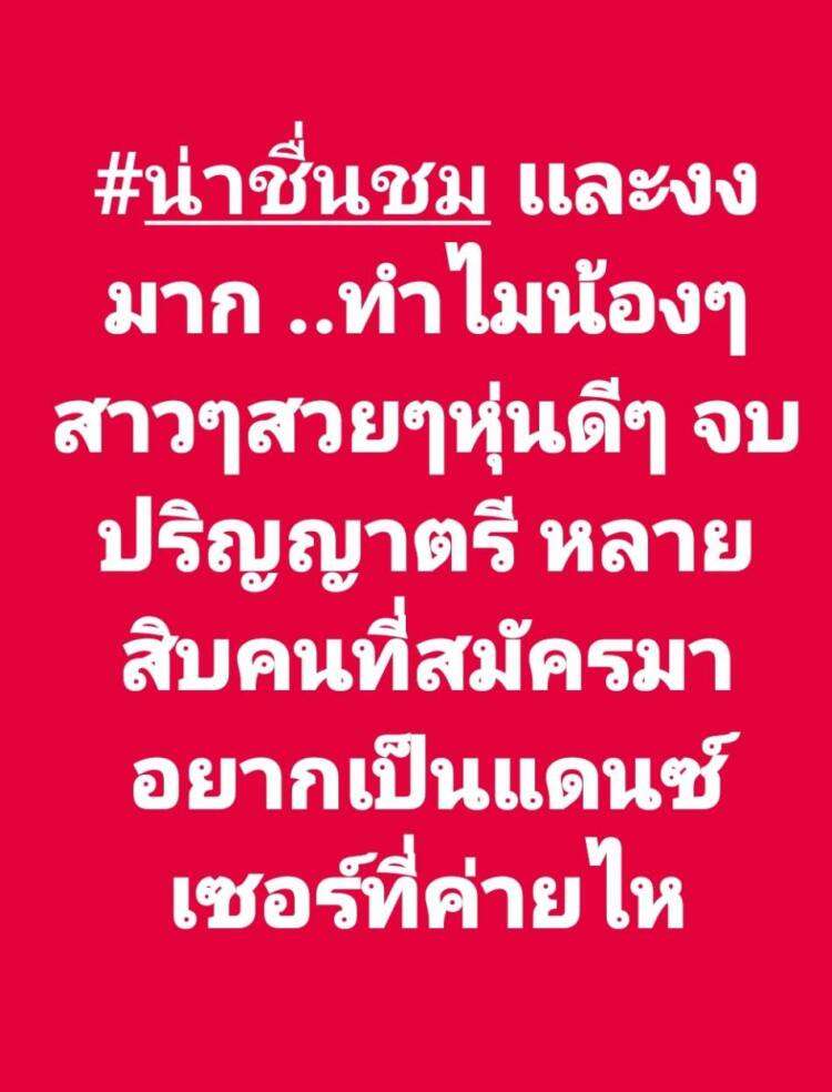 ต่อมาได้โพสต์ว่า #น่าชื่นชม และงงมาก ทำไมน้องๆ สาวๆ สวยๆ หุ่นดีๆ จบปริญญาตรีหลายสิบคนที่สมัครอยากเป็นแดนเซอร์ที่ค่ายไห และ #เต้นเก่ง เด้งดี มีเวลา มาหาเงิน หุ่นดี ขาเรียว เอวบาง ท้องไม่ลาย เพศหญิงแท้ อายุ 18-25 ปี สูง 160+ น้ำหนัก 50- ถามมาเยอะตอบครบทีเดียว รับสมัครแดนซ์ประจำค่ายไห รายได้ 50,000+