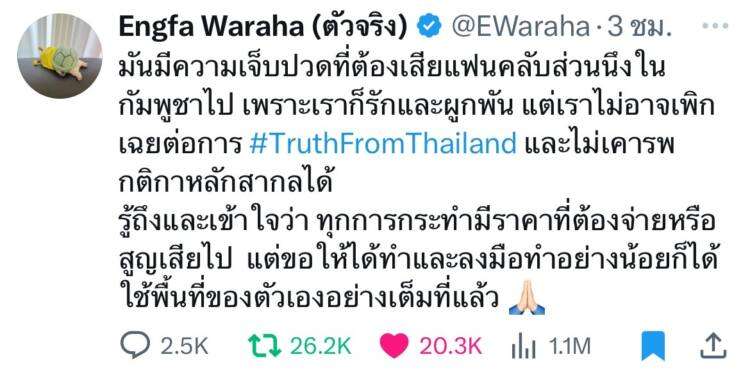 “อิงฟ้า วราหะ” เคลื่อนไหวแล้ว! หลังถูกทัวร์ชาวเน็ตกัมพูชาลง ยืนยันจุดยืนเพื่อความจริง พร้อมขอใช้พื้นที่ของตนเองอย่างเต็มที่