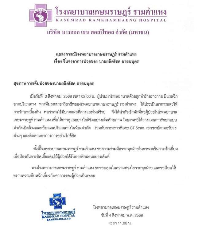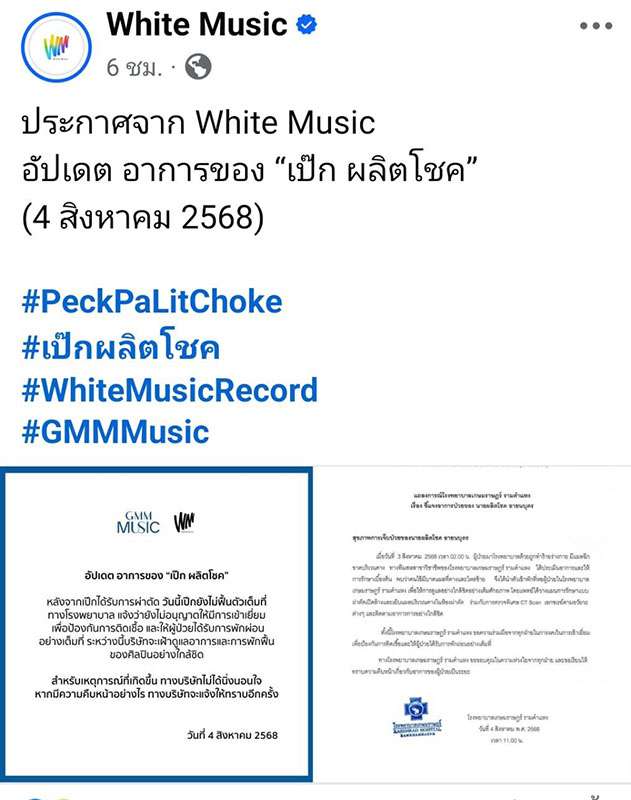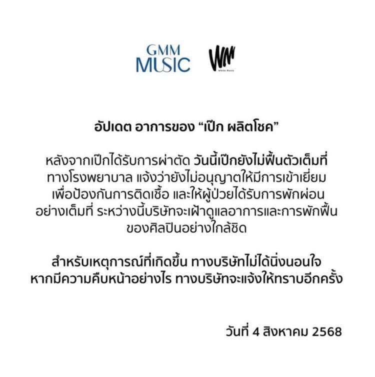 ค่าย “White Music” ต้นสังกัด “เป๊ก ผลิตโชค อายนบุตร” ได้ออกประกาศอาการล่าสุด หลังผ่าตัด ยังฟื้นตัวไม่เต็มที่ ทางรพ.แจ้งไม่อนุญาตให้มีการเข้าเยี่ยม เพื่อป้องกันการติดเชื้อ และให้ผู้ป่วยได้รับการพักผ่อนอย่างเต็มที่ ระหว่างนี้ บริษัทจะเฝ้าดูแลอาการอย่างใกล้ชิด