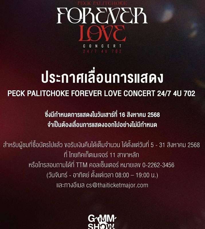 สำหรับคอนเสิร์ตใหญ่ เป๊ก ผลิตโชค ที่จะจัดในวันที่ 16 ส.ค. ทาง GMM SHOW ได้เผยว่าจำเป็นต้องเลื่อนออกไปอย่างไม่มีกำหนด สำหรับผู้ที่ซื้อบัตรไปแล้ว สามารถขอรับเงินคืนได้เต็มจำนวน ได้ตั้งแต่วันที่ 5-31 ส.ค.68 ที่ไทยทิคเก็ตเมเจอร์ 11 สาขาหลัก หรือโทรศัพท์สอบถามได้ที่คอลเซ็นเตอร์ หมายเลข 02-262-3456 (วันจันทร์-อาทิตย์ เวลา 08.00-19.00 น.) และทางอีเมล cs@thaiticketmajor.com