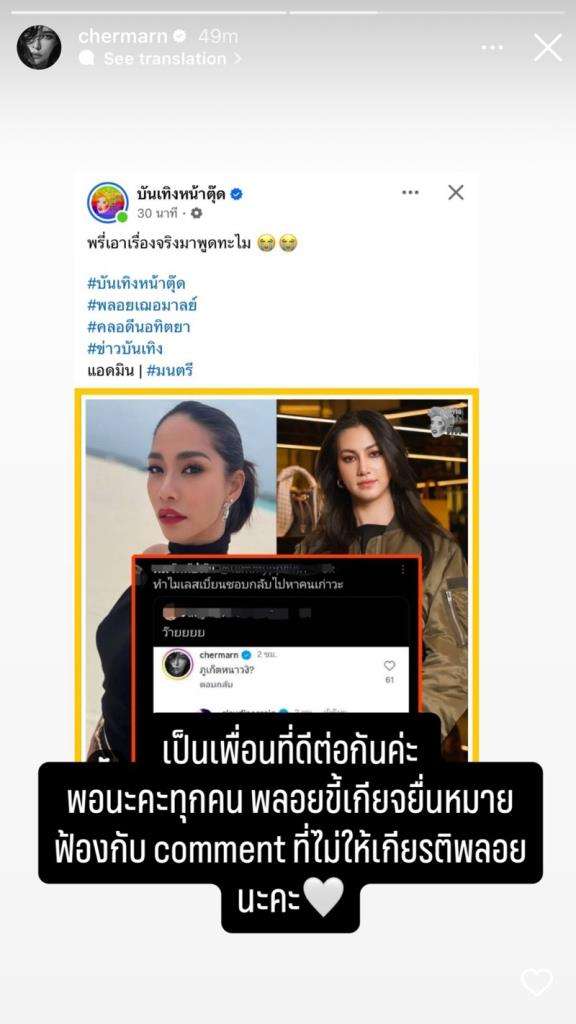 งานนี้พลอยเลยออกมาฟาดข้อความดังกล่าวผ่านสตอรี่ ลั่น “เป็นเพื่อนที่ดีต่อกันค่ะ พอนะคะทุกคน พลอยขี้เกียจยื่นหมายฟ้องกับคอมเมนต์ที่ไม่ให้เกียรติพลอยนะคะ 🤍”