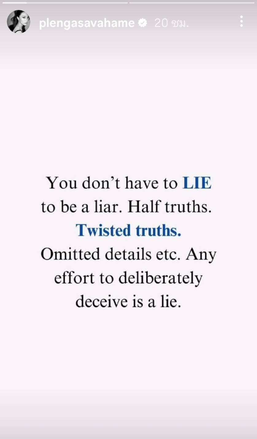 You don’t have to LIE to be a liar. Half truths. Twisted truths. Omitted details etc. Any effort to deliberately deceive is a lie. (คุณไม่จำเป็นต้องโกหกด้วยคำพูดถึงจะเป็นคนโกหกได้ ความจริงครึ่งเดียว ความจริงที่บิดเบือนจากเดิม การละเลยที่จะเปิดเผยรายละเอียด ความพยายามใดๆ ที่หลอกลวงผู้อื่นโดยเจตนาถือเป็นการโกหกทั้งสิ้น)