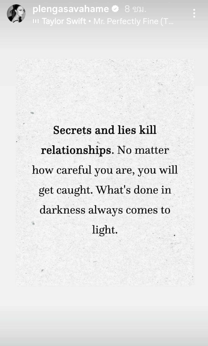 Secrets and lies kill relationships. No matter how careful you are, you will get caught. What’s done in darkness always comes to light.” (ความลับและการโกหกทำลายความสัมพันธ์ ไม่ว่าคุณจะระมัดระวังแค่ไหน คุณก็จะถูกจับได้อยู่ดี สิ่งที่ทำในความมืดมิดย่อมถูกเปิดเผยสู่แสงสว่างเสมอ)