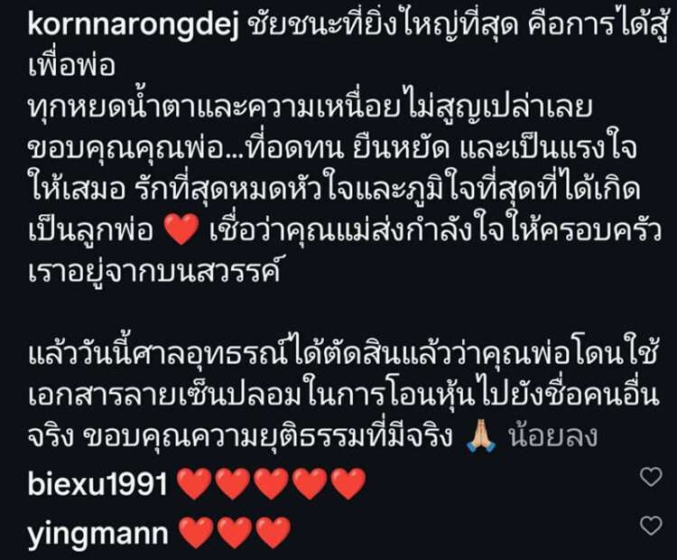 แล้ววันนี้ศาลอุทธรณ์ได้ตัดสินแล้วว่าคุณพ่อโดนใช้เอกสารลายเซ็นปลอมในการโอนหุ้นไปยังชื่อคนอื่นจริง ขอบคุณความยุติธรรมที่มีจริง 🙏🏼”
