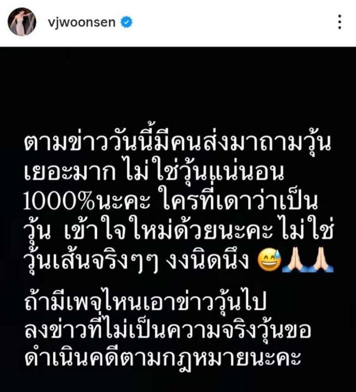 “ตามข่าววันนี้มีคนส่งมาถามวุ้นเยอะมาก ไม่ใช่วุ้นแน่นอน 1000% นะคะ ใครที่เดาว่าเป็นวุ้น เข้าใจใหม่ด้วยนะคะ ไม่ใช่วุ้นเส้นจริงๆๆ งงนิดนึง ถ้ามีเพจไหนเอาข่าววุ้นไปลงข่าวที่ไม่เป็นความจริง วุ้นขอดำเนินคดีตามกฎหมายนะคะ”