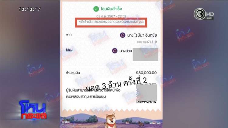 สวัสดิ์ : ครับ ตั้งแต่เมื่อวานมาคุยกับพี่หนุ่ม ผมไปนั่งทำแต่ทำไม่ทัน ผมปริ้นท์ออกมาแต่ยังไม่เปิดนะ มีชื่อบุคคลที่สาม ผมไปพบเขา 2 ทุ่ม บ่ายสามเขาวิ่งไปธนาคาร เอาสเตทเมนต์มาให้ผม เขาบอกว่า 2 ทุ่ม คุณอามาที่บ้านหนูได้มั้ย ผมบอกว่าไม่ได้หรอก ผมไม่รู้จักคุณ ผมไม่ไป เขาก็มาเจอกับผม เอาสเตทเมนต์มาหมดเลย บัญชีที่ผมดู ลงท้ายด้วยอะไรตรงทุกอย่าง ผมก็ไล่วันว่ามันไม่มี เกิดอะไรขึ้นวะ ไม่ได้คิดว่ามีพิรุธนะ ไม่เอะใจ พอกลับมาถึงบ้าน เมื่อวานผมไปสรุปมา 30 รายการ วันที่ 21 ส.ค.67 เวลา 12.40 น. บอกว่าโอนไปให้น.ส.หมวย ปรากฏว่าวันที่ 2 ก.ย. 67 โอนไป 1.9 ล้าน วันที่ 3 ก.ย. เวลา 22.52 โอนไป 9.8 แสน วันที่ 7 ก.ย.67 โอนไป 1.6 ล้าน ที่ผมนั่งทำเมื่อเช้า เตรียมไว้ โอ้โห นี่ขนาด 10 ใบนะ รหัสอ้างอิงเดียวกันหมดเลย