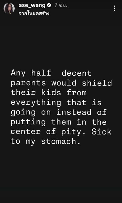 “ครอบครัวของผู้ที่เสียหาย ก็มีโมเมนต์มากมายทั้งทุกข์ทั้งเศร้าทั้งเสียใจ ทั้งหมดหนทางแบบนั้นกับครอบครัวเช่นกันแต่ไม่เคยเอาลงโพสต์เรียกคะแนนสงสารใดๆ ไม่ลากเด็กลงมาปนเปื้อนกับสิ่งเหล่านี้”
