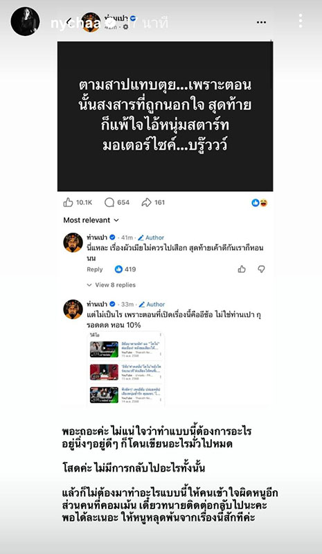 งานนี้ทำณิชาเดือดแตก ฟาดสตอรี่อินสตาแกรมรัวๆ โดยแคปโพสต์จากเพจท่านเปา ที่ระบุว่า ตามสาปแทบตุย เพราะตอนนั้นสงสารที่ถูกนอกใจ สุดท้ายก็แพ้ใจไอ้หนุ่มสตาร์ทมอเตอร์ไซค์…บรู๊วว์ , นี่แหละเรื่องผัวเมียไม่ควรไปเสื-ก สุดท้ายเขาดีกันเราก็หอน โดยณิชา ได้เขียนแคปชั่นฟาดว่า