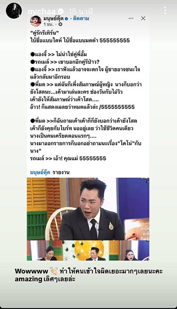 รวมทั้งได้เผยโพสต์จากเพจมนุษย์ตุ๊ด ที่เสนอข่าวการใบ้ชื่อแบบมดดำ ณิชา ได้เขียนแคปชั่นว่า “Wowww (อีโมจิปรบมือ) ทำให้คนเข้าใจผิดเยอะมากๆ เลยนะคะ amazing เลิศๆ เลยล่ะ”