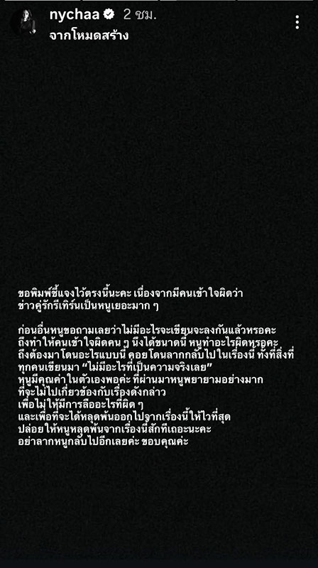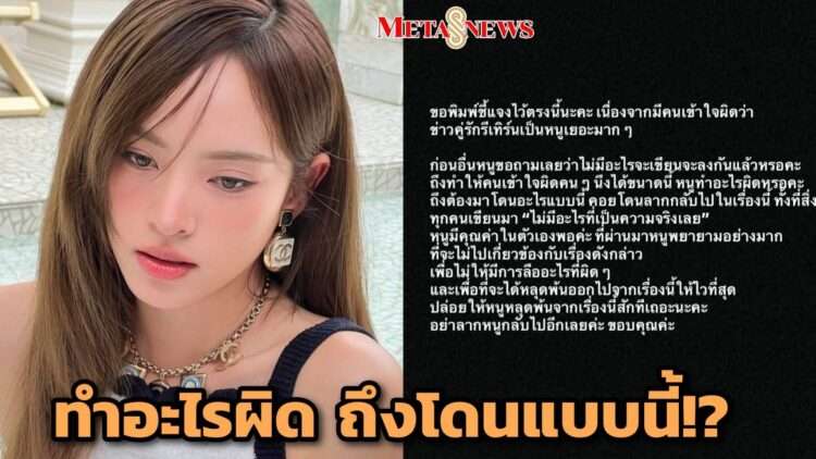 “พอเถอะค่ะ ไม่แน่ใจว่าทำแบบนี้ต้องการอะไร อยู่นิ่งๆ อยู่ดีๆ ก็โดนเขียนอะไรมั่วไปหมด โสดค่ะ ไม่มีการกลับไปอะไรทั้งนั้น แล้วก็ไม่ต้องมาทำอะไรแบบนี้ให้คนเข้าใจผิดหนูอีก ส่วนคนที่คอมเมนต์ เดี๋ยวทนายติดต่อกลับไปนะคะ พอได้ละเนอะ ให้หนูหลุดพ้นจากเรื่องนี้สักทีค่ะ