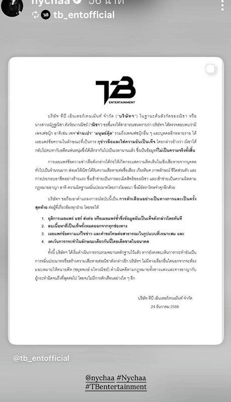 รวมทั้งเผยแถลงจากต้นสังกัด ที่ระบุถึงเพจ ท่านเปา , มนุษย์ตุ๊ด และเพจอื่นๆ ที่ได้นำเสนอข่าวในลักษณะกุข่าวลือและใส่ความอันเป็นเท็จ ว่ากลับไปคบกับแฟนเก่าที่ได้เลิกรากันไปแล้วนานแล้วนั้น การเผยแพร่ข่าวดังกล่าวทำให้เกิดความคิดเห็นในเชิงเสียหายจากบุคคลทั่วไปเป็นจำนวนมาก ส่งผลให้ณิชาได้รับความเสียหายต่อชื่อเสียง เกียรติยศ ภาพลักษณ์ ชีวิตส่วนตัวและการประกอบอาชีพอย่างร้ายแรง ซึ่งเข้าข่าวเป็นการละเมิดสิทธิของณิชา และเข้าข่ายความผิดตามกฎหมายอาญา อาทิ ความผิดฐานหมิ่นประมาทโดยการโฆษณามีอัตราโทษจำคุกอีกด้วย