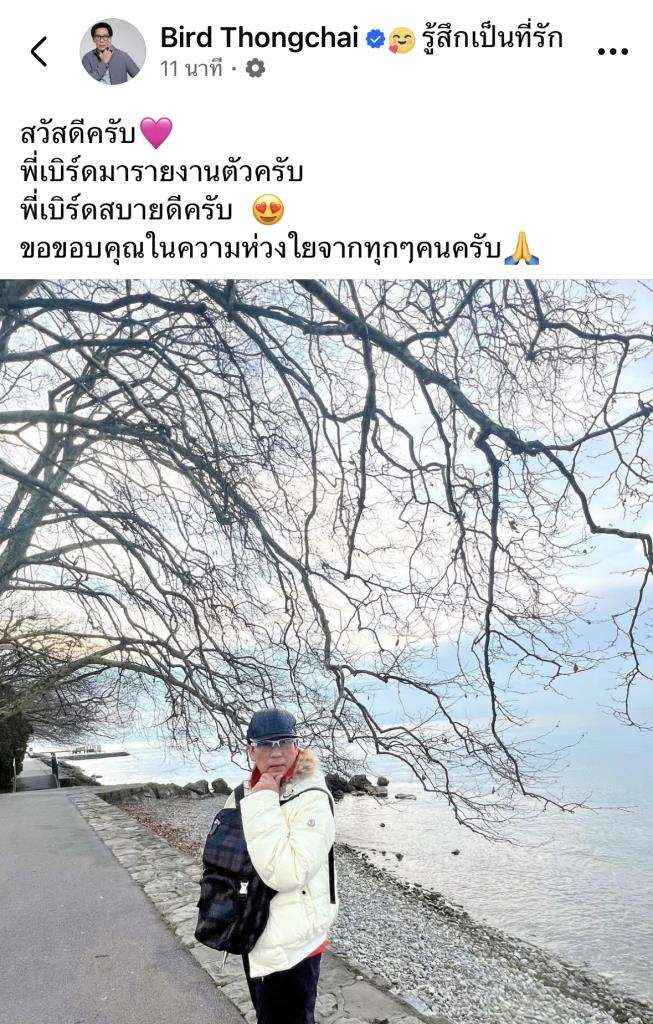 ล่าสุด พี่เบิร์ด ได้เผยข้อความผ่านโซเชียลมีเดียส่วนตัว ระบุว่า “สวัสดีครับ🩷 พี่เบิร์ดมารายงานตัวครับ พี่เบิร์ดสบายดีครับ 😍 ขอขอบคุณในความห่วงใยจากทุกๆ คนครับ🙏”
