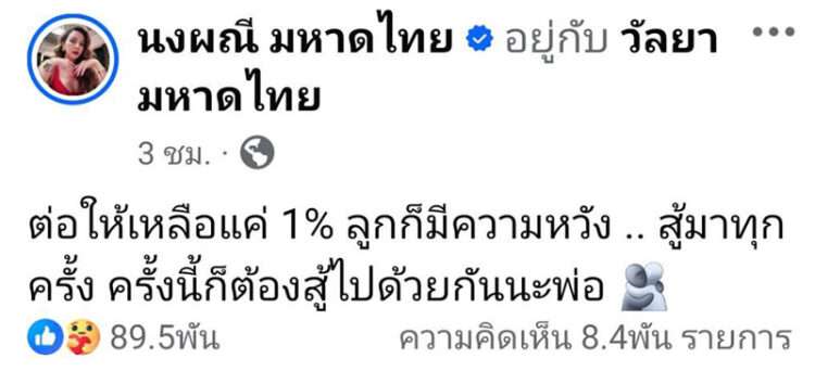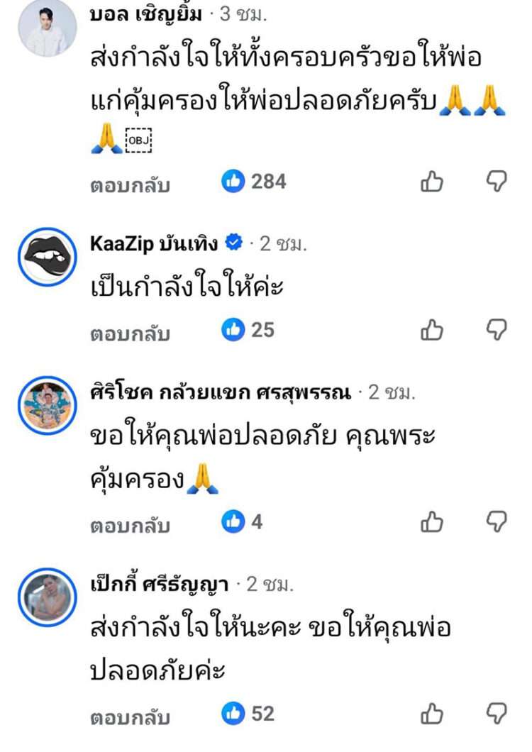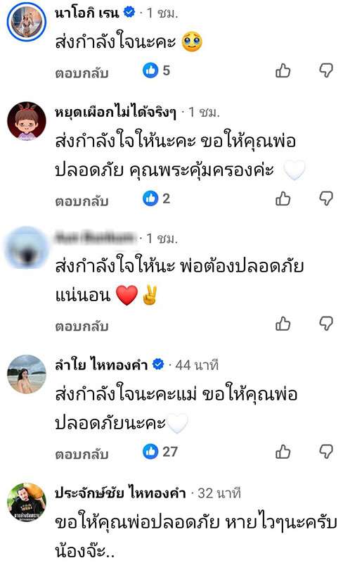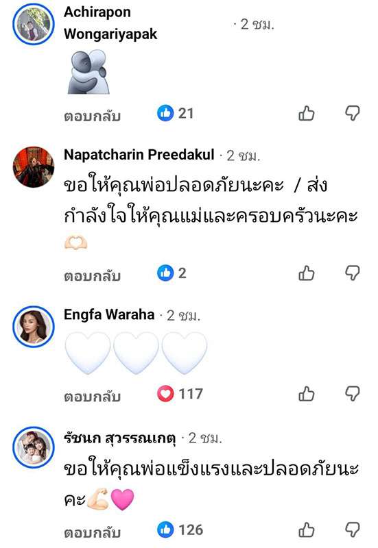 โดยจ๊ะได้เผยว่า “ต่อให้เหลือแค่ 1% ลูกก็มีความหวัง สู้มาทุกครั้ง ครั้งนี้ก็ต้องสู้ไปด้วยกันนะพ่อ” ท่ามกลางกำลังใจจากคนบันเทิง อาทิ บอล เชิญยิ้ม – ส่งกำลังให้ทั้งครอบครัว ขอให้พ่อแก่คุ้มครองให้พ่อปลอดภัยครับ, เป็กกี้ ศรีธัญญา – ส่งกำลังใจให้นะคะ ขอให้คุณพ่อปลอดภัย, อิงฟ้า วราหะ – ส่งอีโมจิหัวใจสีขาวให้ 3 ดวง, เจนนี่ รัชนก สุวรรณเกตุ – ขอให้คุณพ่อแข็งแรงและปลอดภัยนะคะ, ลำไย ไหทองคำ – ส่งกำลังใจนะคะแม่ ขอให้คุณพ่อปลอดภัย, ประจักษ์ชัย ไหทองคำ – ขอให้คุณพ่อปลอดภัย หายไวๆ นะครับน้องจ๊ะ ฯลฯ