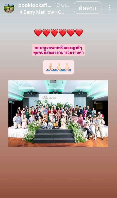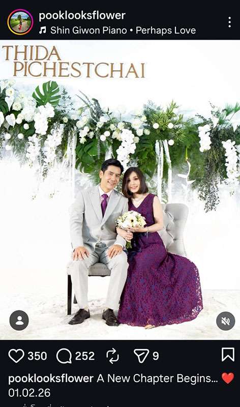 ขณะที่ฝ่ายปุ๊กลุกได้โพสต์ภาพเดียวกัน เขียนแคปชั่นประกาศการเริ่มต้นชีวิตคู่ว่า “A New Chapter Begins… 01.02.26” ขณะที่สตอรี่ได้โพสต์ภาพหมู่ ขอบคุณครอบครัวและญาติที่สละเวลามาร่วมงาน