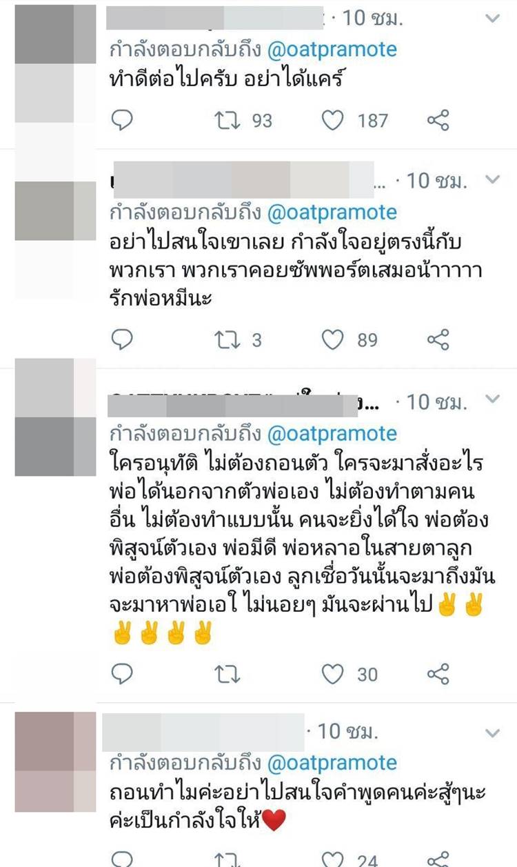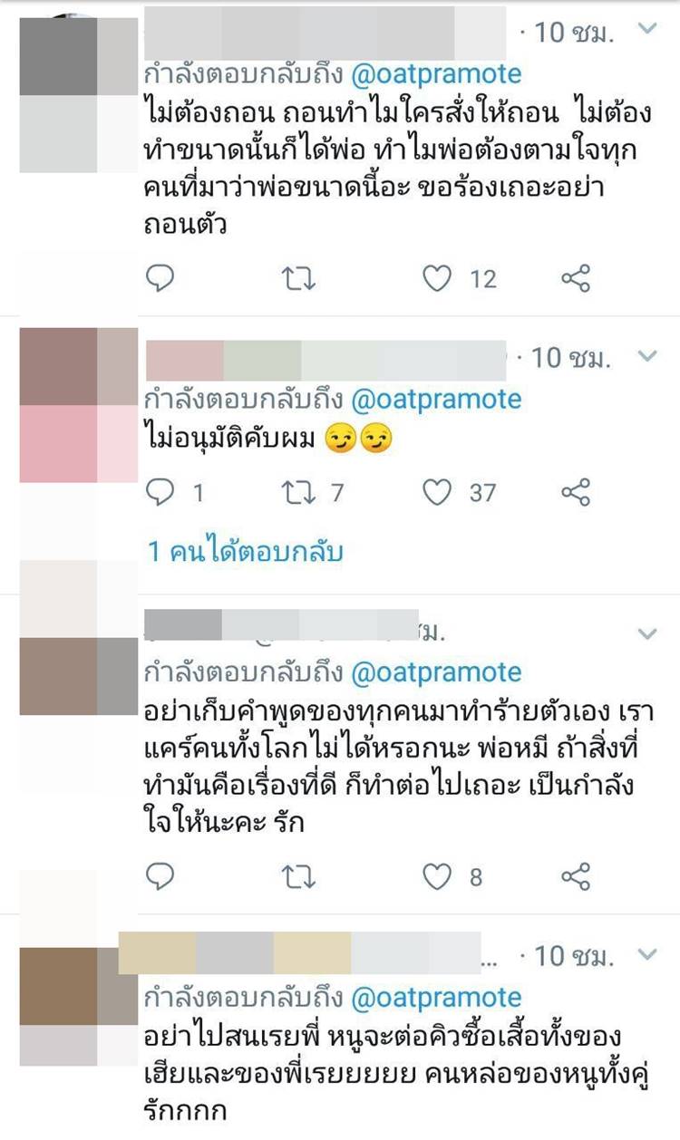 แต่ก็ดูเหมือนว่าเจ้าตัวจะเจอคอมเมนต์ที่รุนแรงเกี่ยวกับเรื่องนี้อยู่ไม่น้อย บ้างก็ว่าไม่เหมาะ ไม่ตรงคอนเซ็ปต์ ไม่เข้าพวก จนกระทั่งล่าสุด (10 มกราคม 2562) โอ๊ต ปราโมทย์ ก็ได้ออกมาโพสต์ข้อความลงทวิตเตอร์ ระบุว่า “ให้ผมถอนตัวก็ได้นะครับ…”