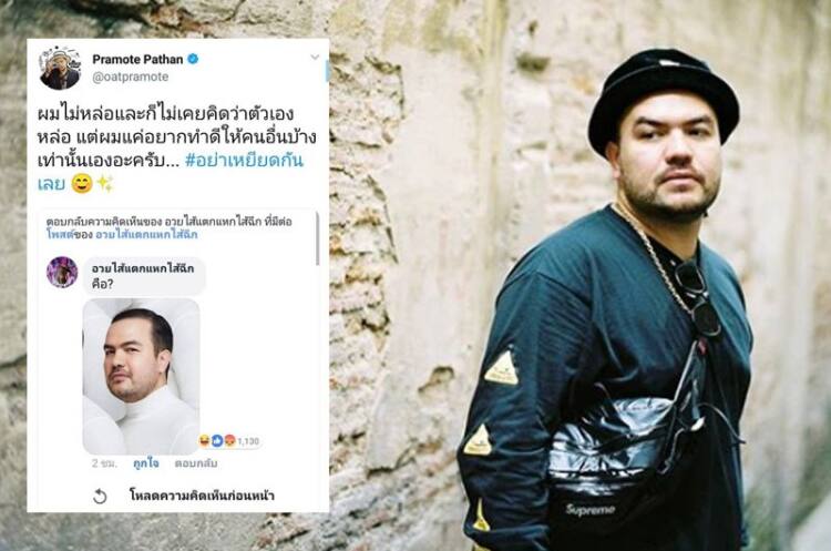 เช่นเดียวกับหนุ่ม โอ๊ต ปราโมทย์ ที่ได้ไปเจอคอมเมนต์เกี่ยวกับตนเองในเพจดัง อวยไส้แตกแหกไส้ฉีก จนต้องออกมาทวีตข้อความว่า “ผมไม่หล่อและก็ไม่เคยคิดว่าตัวเองหล่อ แต่ผมแค่อยากทำดีให้คนอื่นบ้างเท่านั้นเองอะครับ… #อย่าเหยียดกันเลย”