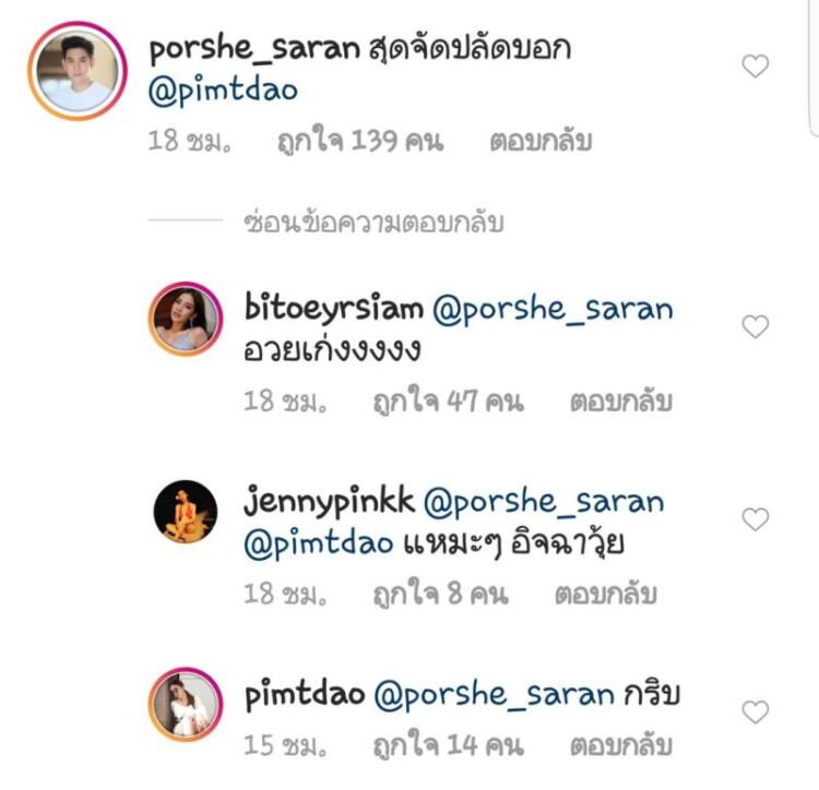 อีกคู่รักใหม่ของวงการบันเทิง ระหว่างพระเอกกับนางร้าย พอร์ช ศรัณย์ กับ ดาว พิมพ์ทอง ซึ่งคู่นี้ชัดเจนไม่ต้องระบุสถานะก็เห็นว่า พอร์ช-ดาว กำลังอินเลิฟมากแค่ไหน ดูจากการหยอดกันไปมาของทั้งคู่ในโซเชียล
