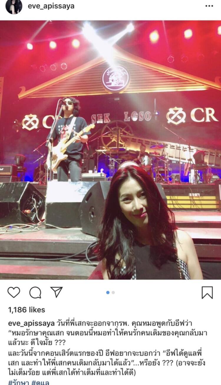 “วันที่พี่เสกจะออกจากรพ. คุณหมอพูดกับอีฟว่า “หมอรักษาคุณเสก จนตอนนี้หมอทำให้คนรักคนเดิมของคุณกลับมาแล้วนะ ดีใจมั้ย? และวันนี้จากคอนเสิร์ตแรกของปี อีฟอยากจะบอกว่า “อีฟได้ดูแลพี่เสก และทำให้พี่เสกคนเดิมกลับมาได้แล้ว” หรือยัง ? (อาจจะยังไม่เต็มร้อย แต่พี่เสกได้ทำเต็มที่และทำได้ดี)#รักษา #ดูแล”