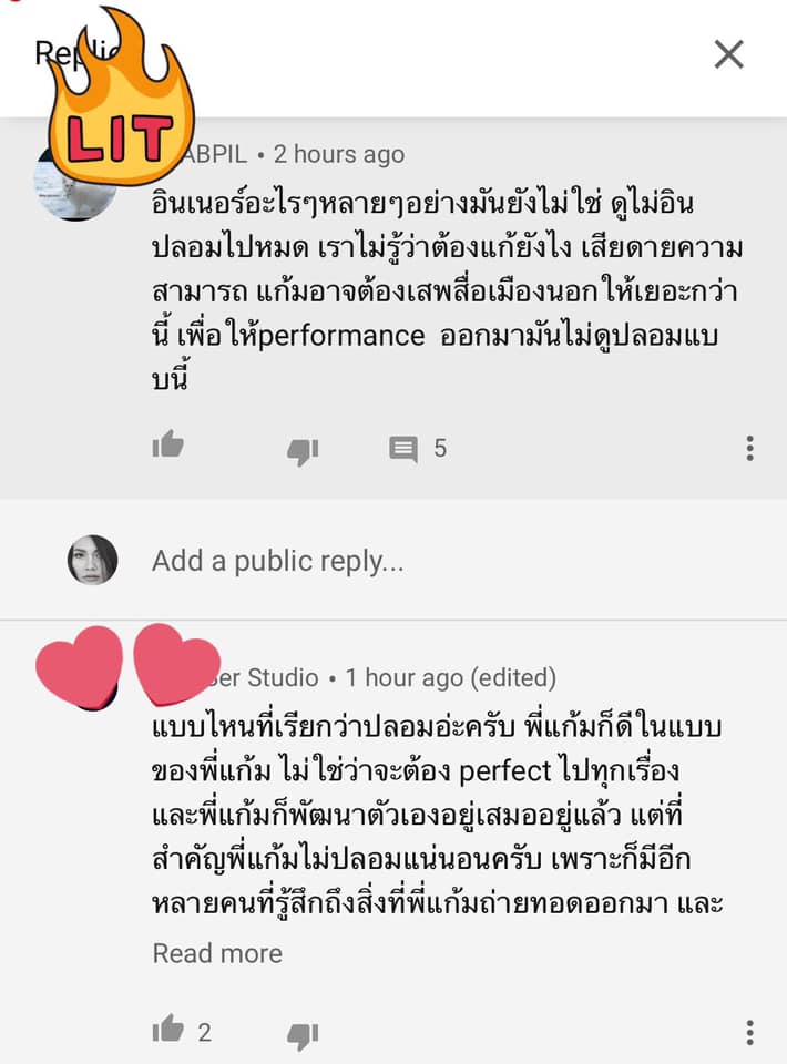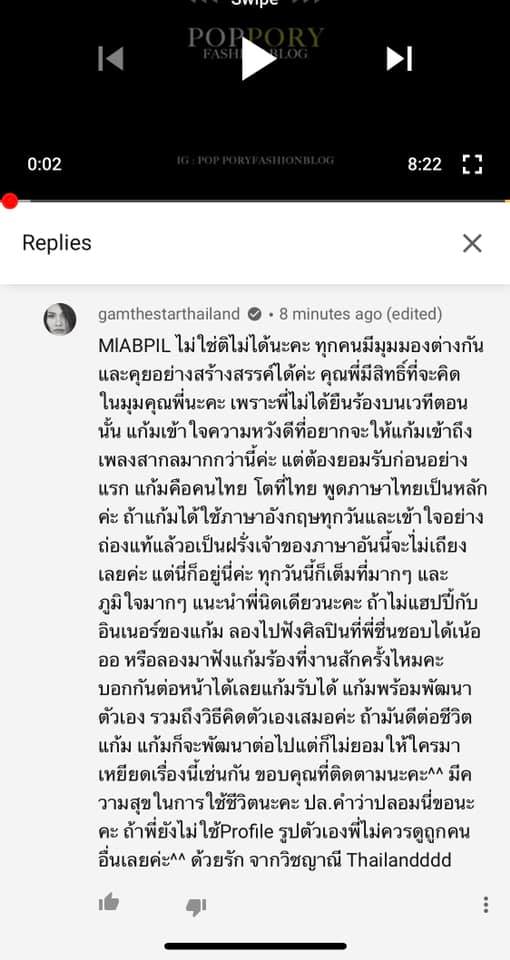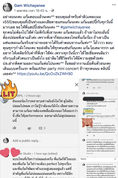 นอกจากนี้ แก้มยังบอกว่า อยากให้ลองมาฟังตนร้องสด ๆ สักครั้ง ตนพร้อมพัฒนาตนเอง และทิ้งท้ายไว้เจ็บ ๆ ว่า “คำว่าปลอมนี่ขอนะคะ ถ้าพี่ยังไม่ใช้โปรไฟล์รูปตัวเอง ไม่ควรดูถูกคนอื่นค่ะ”