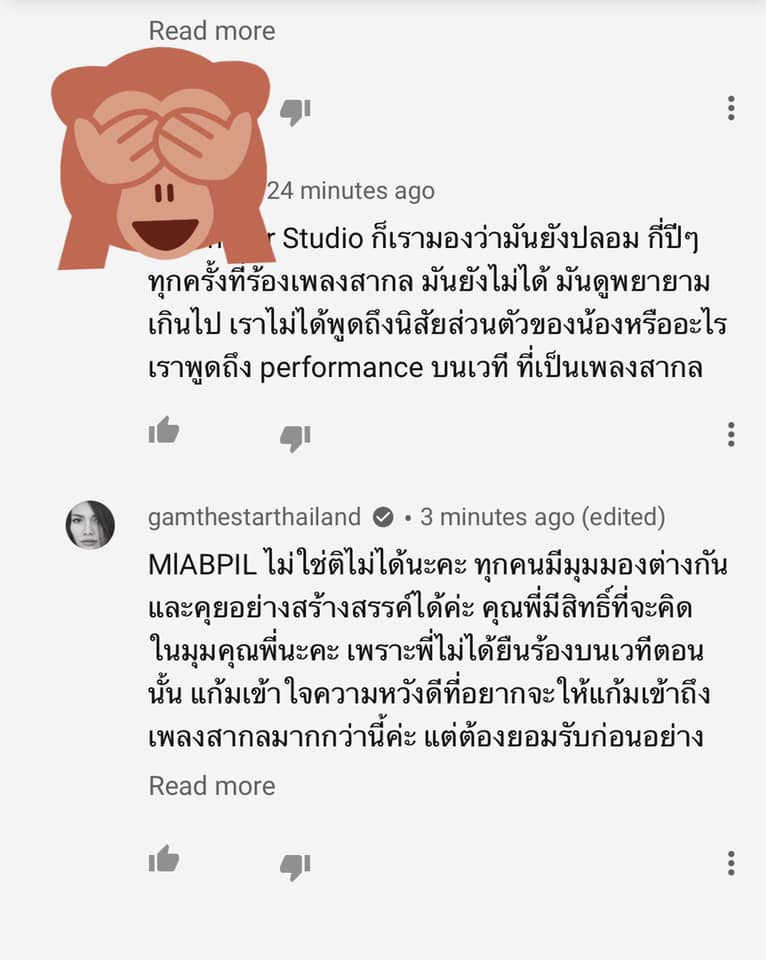 ด้านแก้มเองได้เข้าไปห้ามทัพด้วยการคอมเมนต์คืนว่า เรื่องแบบนี้ ทุกคนมีมุมมองที่ต่างกันได้ คุณไม่ได้ยืนอยู่ตรงนั้นบนเวที ตนเข้าใจในความหวังดี แต่ต้องยอมรับกันก่อนว่า แก้มเป็นคนไทย โตที่ไทย ใช้ภาษาไทยเป็นหลัก หากตนใช้ภาษาอังกฤษ เป็นเจ้าของภาษาแล้วตนคงไม่เถียง และทุกวันนี้ ตนก็เต็มที่กับงานมาก