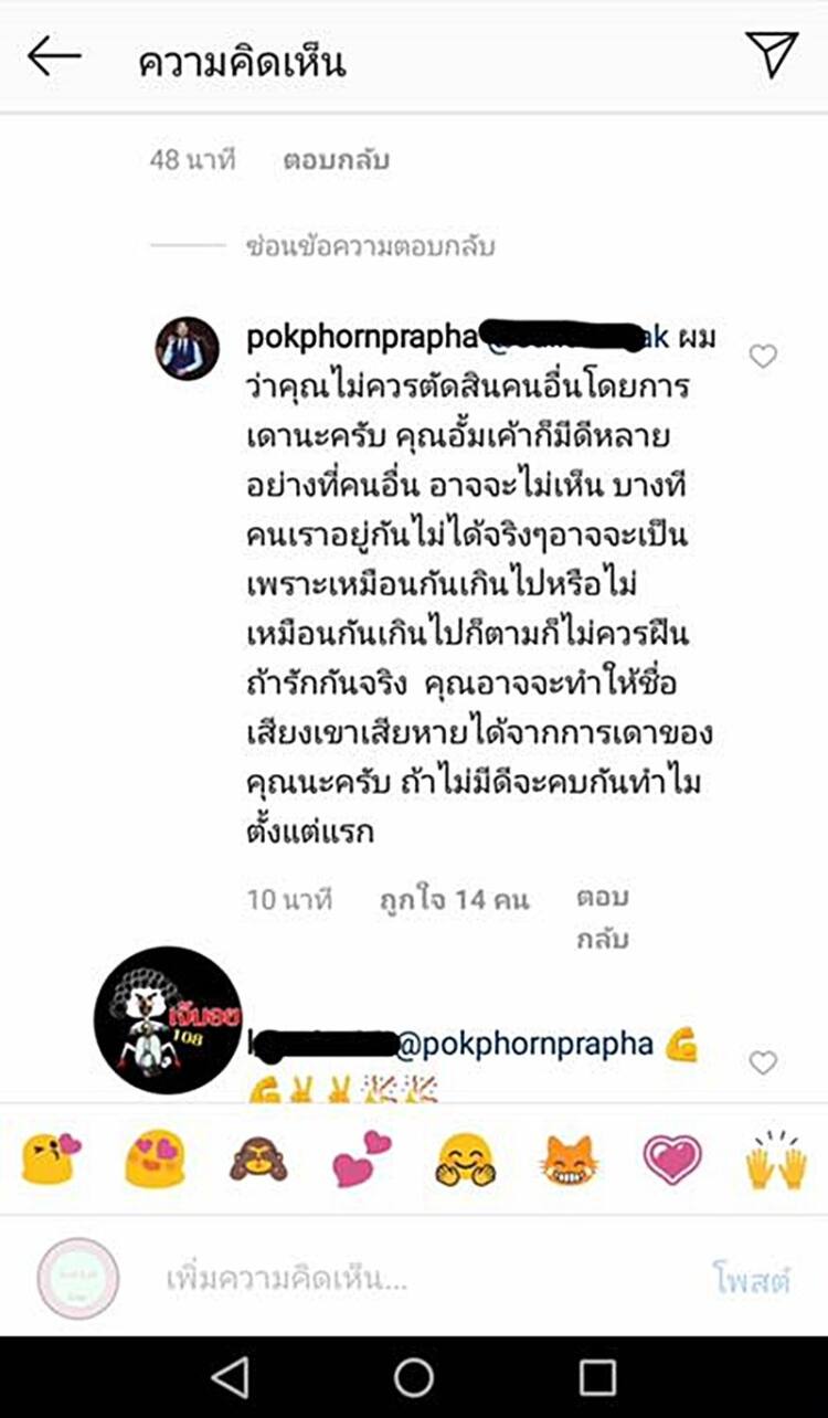 ด้านหนุ่มพกเลยไม่ยอมอยู่เฉย แม้จะเลิกรากันไปแล้ว แต่ขอออกโรงปกป้องอดีตแฟนสาว โดยได้ไปตอบกลับคอมเมนต์ว่า “ผมว่าคุณไม่ควรตัดสินคนอื่นโดยการเดานะครับ คุณอั้มเค้าก็มีดีหลายอย่างที่คนอื่นอาจจะไม่เห็น บางทีคนเราอยู่กันไม่ได้จริง ๆ อาจจะเป็นเพราะเหมือนกันเกินไป หรือไม่เหมือนกันเกินไปก็ตาม ก็ไม่ควรฝืนถ้ารักกันจริง คุณอาจจะทำให้ชื่อเสียงเขาเสียหายได้จากการเดาของคุณนะครับ ถ้าไม่มีดี จะคบกันทำไมตั้งแต่แรก”