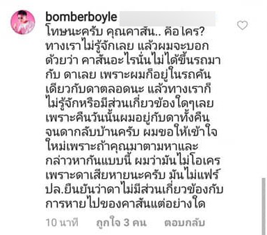 ล่าสุดคนใกล้ชิดดา เอ็นโดรฟิน ออกโรงสกัดข่าว โดยยืนยันว่าไม่มีคนชื่อคาสันนั่งรถไปกับดา และไม่แฟร์ที่กล่าวหากันแบบนี้ ขณะที่ตนก็อยู่รถคันเดียวกับดาตลอด คืนนั้นก็อยู่กับดาทั้งคืนจนดากลับบ้าน ขอให้เข้าใจใหม่ ไม่โอเค เพราะดาเสียหาย ก่อนจะทิ้งท้าย ไม่มีส่วนเกี่ยวข้องกับการหายตัวไปของคาสัน