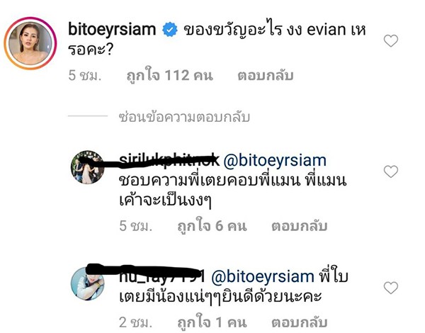 อย่างไรก็ตาม “ใบเตย” ได้เข้าไปเมนต์ถามทำนองว่า “ของขวัญอะไร งง evian เหรอคะ?” แต่หลายคนก็คาดว่าสาวใบเตยน่าจะท้องแล้ว แต่ไม่หลุดจากปากเพราะอยากถือเคล็ด 3 เดือนนั่นเอง