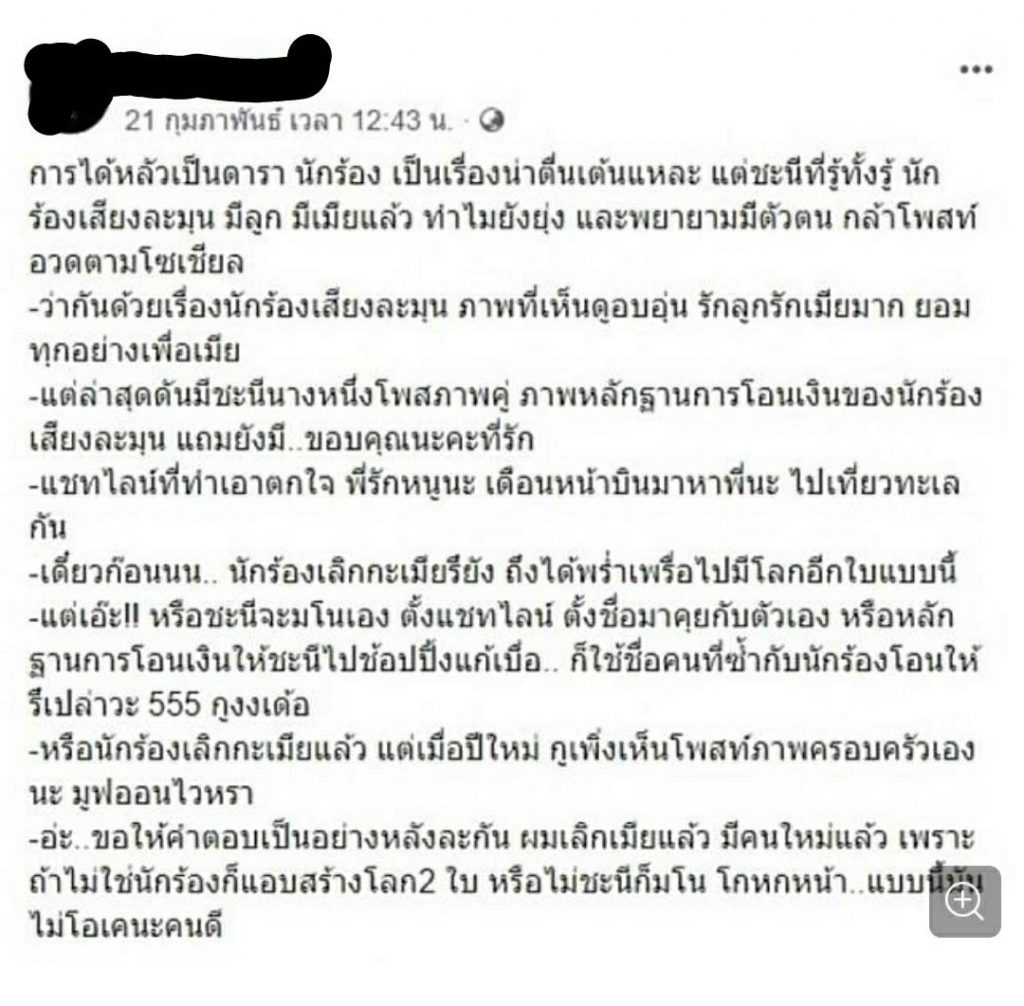 “ตอนเช้าเป็นช่วงที่เราเริ่มมีปัญหามีเรื่องมีราวขึ้นมา มีเรื่องของการโพสต์ว่าเป็นนักร้องเสียงละมุนมีลูกมีเมียแล้ว แต่ไปมีสัมพันธ์ลึกซึ้งกับผู้หญิงอีกคนนึง เอ๊ะ ยังไง หรือผู้หญิงคนนี้จะมโนเอาเอง หรือนักร้องคนนี้จะสร้างโลกใบที่สอง แต่ก็เอ๊ะ ทำไมถึงมีสลิปในการโอนเงิน ทำไมจะต้องมีแชตไลน์ข้อความกับผู้หญิงท่านนี้ในการจะให้บินไปหาเพื่อจะพาไปเที่ยวทะเล 4-5 วัน พี่รักนะ พี่โอนเงินให้ใช้ก่อนนะ อะไรแบบนี้”