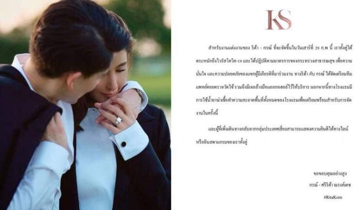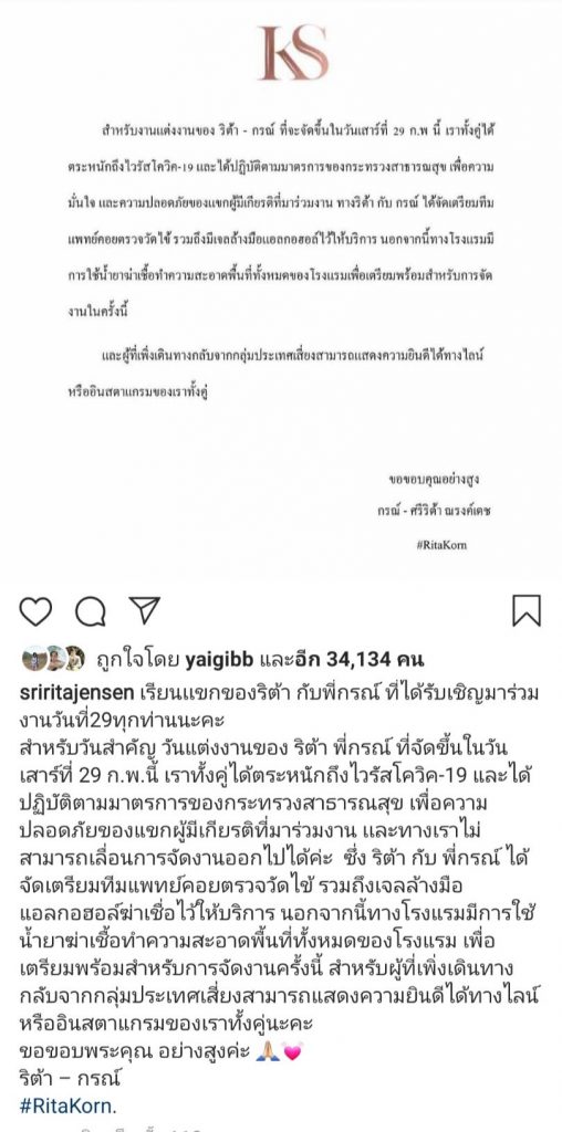 “เรียนเเขกของริต้า กับพี่กรณ์ ที่ได้รับเชิญมาร่วมงานวันที่ 29 ทุกท่านนะคะ สำหรับวันสําคัญ วันแต่งงานของ ริต้า พี่กรณ์ ที่จัดขึ้นในวันเสาร์ที่ 29 ก.พ.นี้ เราทั้งคู่ได้ตระหนักถึงไวรัสโควิค-19 และได้ปฏิบัติตามมาตรการของกระทรวงสาธารณสุข เพื่อความปลอดภัยของแขกผู้มีเกียรติที่มาร่วมงาน เเละทางเราไม่สามารถเลื่อนการจัดงานออกไปได้ค่ะ ซึ่ง ริต้ากับพี่กรณ์ ได้จัดเตรียมทีมแพทย์คอยตรวจวัดไข้ รวมถึงเจลล้างมือแอลกอฮอล์ฆ่าเชื่อไว้ให้บริการ นอกจากนี้ทางโรงแรมมีการใช้น้ำยาฆ่าเชื้อทำความสะอาดพื้นที่ทั้งหมดของโรงแรม เพื่อเตรียมพร้อมสำหรับการจัดงานครั้งนี้ สำหรับผู้ที่เพิ่งเดินทางกลับจากกลุ่มประเทศเสี่ยงสามารถแสดงความยินดีได้ทางไลน์หรืออินสตาแกรมของเราทั้งคู่นะคะ ขอขอบพระคุณ อย่างสูงค่ะ ??? ริต้า – กรณ์ #RitaKorn”